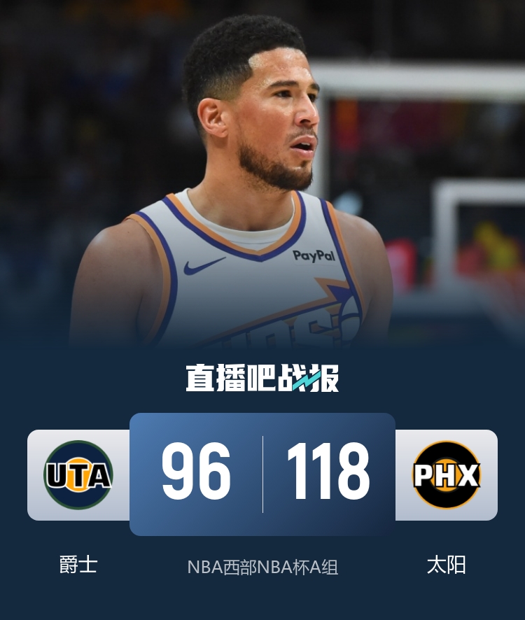 比赛开始,太阳率先发力,攻防两端压制对手,布克单节贡献12分3助攻,帮助球队获得20分的巨大领先,次节太阳命中率骤降,连续打铁失误,爵士连投带罚稍稍缩小分差,半场战罢太阳54-40领先爵士。易边再战,爵士内外开花继续追赶,但布克延续火力,里突外投带队保持优势,爵士全民皆兵奋力反击,将分差追到10分左右,阿伦三分穿针后布克打成2+1,爵士大势已去无力回天。最终,太阳118-96击败爵士,结束了自己的4连败。