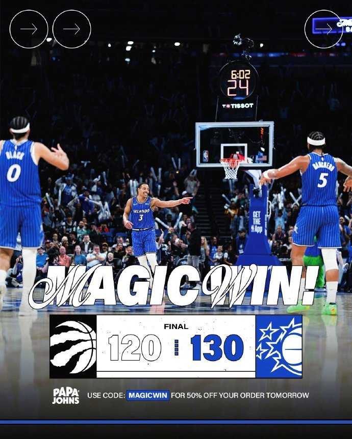 在上一场力克热火,终结4连败之后,魔术今天又在主场以130-120逆转战胜猛龙,取得两连胜,战绩来到25胜22负,继续排在东部第七。猛龙则遭遇两连败,战绩变成29胜21负,暂时被骑士超过,降至东部第五。