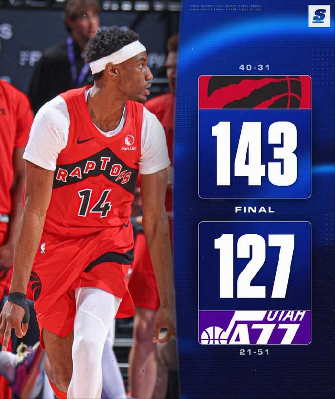 在连续输给掘金和太阳之后,猛龙今天在客场以143-127大胜爵士,终结了两连败,也送给爵士两连败。猛龙战绩来到40胜31负,继续排在东部第五。爵士战绩变成21胜51负,继续排在西部倒数第二。两队本赛季已经交手了两次,猛龙完成了对爵士的双杀。