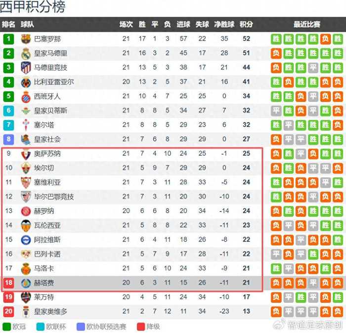 从西甲积分榜来看,皇萨争冠,巴萨52分,皇马51分,两队仅差1分,西甲本赛季争冠非常激烈;但本赛季西甲最为激烈的还是保级,为什么这么说呢?因为西甲第九名到降级区仅差了4分。